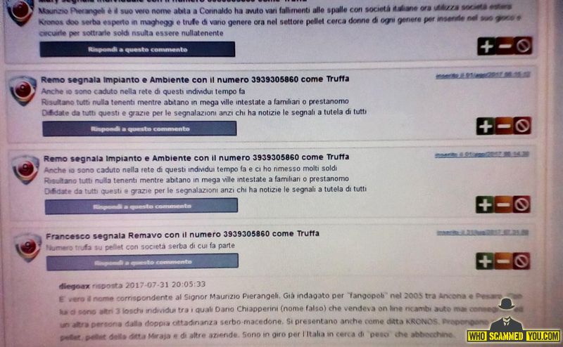 ATTENZIONE!!!!! Segnaliamo la ditta KRONOS dalla Serbia che mediante 4 italiani girano l'Italia spacciandosi per distributori di note aziende di pellet proponendo prezzi incredibili, stanno truffando ovunque. Hanno già fatto arrivare alcuni camion di pellet dalla Serbia senza fare pagare l'Iva al cliente dicendo che non serviva. Come seconda ditta usano anche il nome REMAVO. Siamo a conoscenza che ora sono pariti per la Polonia/Romania in cerca di pellet certificato di abete e/o di conifera. Questi signori si identificano a nome di aziende inesistenti, oppure con falsi documenti spacciandosi per aziende conosciute nel mercato (le quali sono completamente all'oscuro di quanto accade).