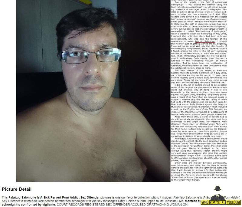 Fabrizio Salomone is a satanist and porn addict. He was convicted of installing spy cameras in women's bathrooms of restaurants in northest Italy and then he showed his idiot face gratifying to have done it and harassed girls sending via mail photos of his naked body.